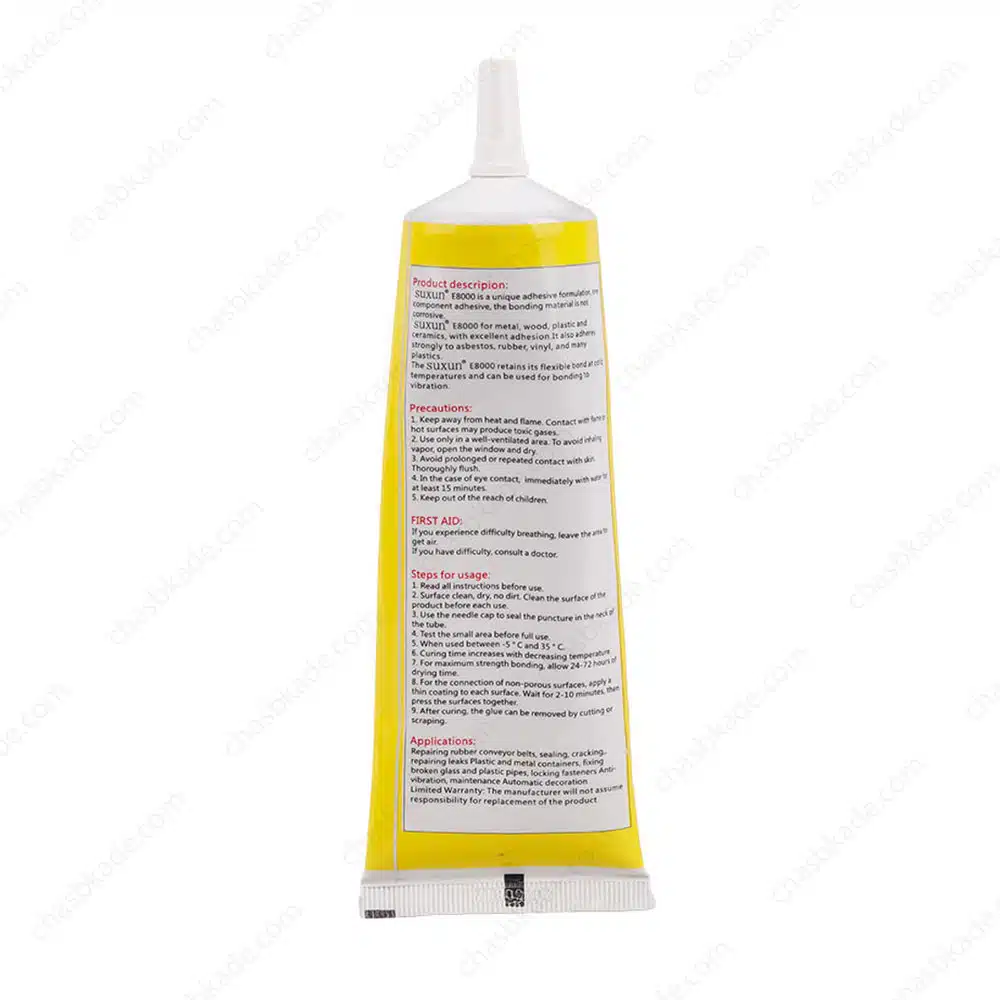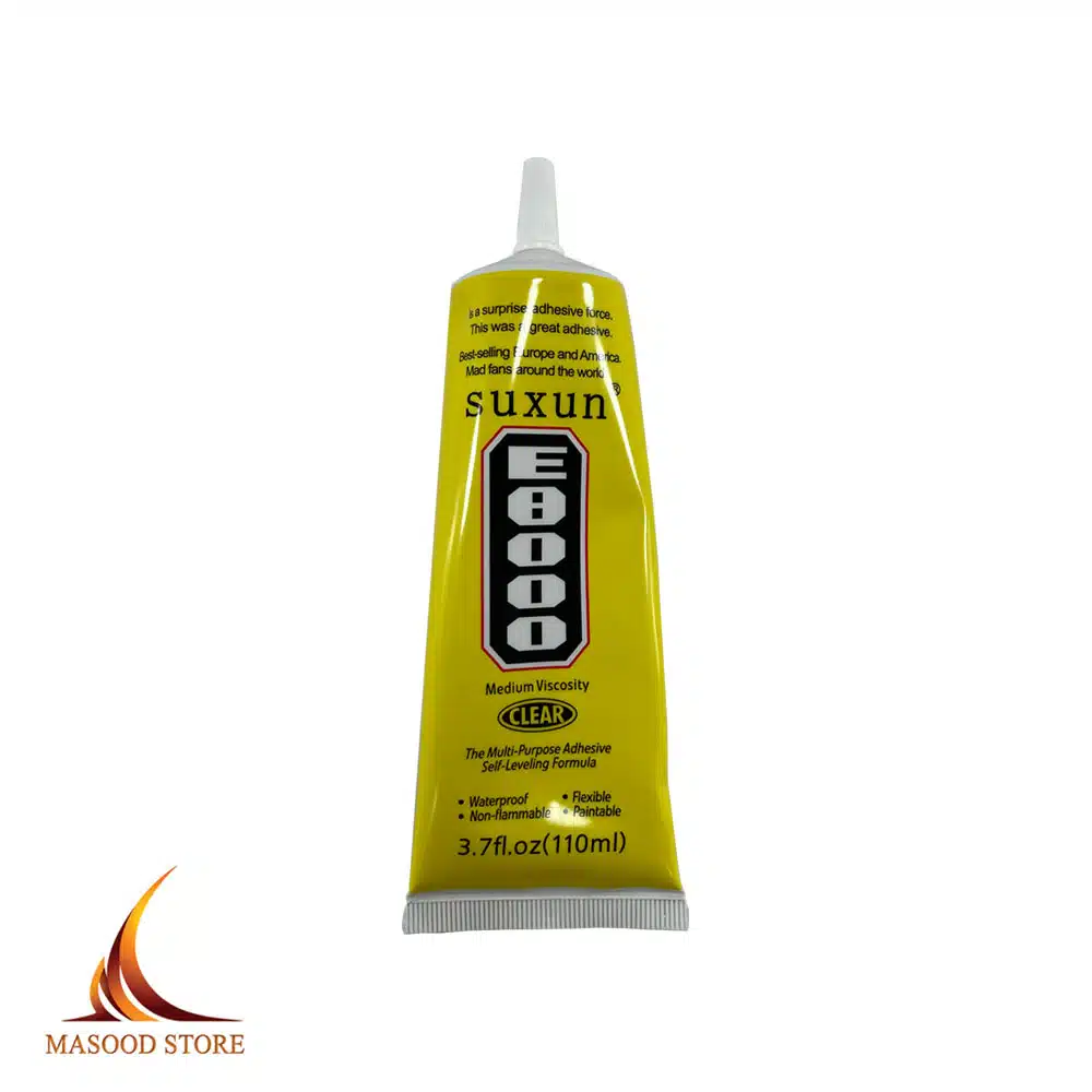 چسب مایع شفاف E8000 SUXUN محصولی بسیار حرفه ای و بهترین انتخاب برای چسباندن انواع لنز و صفحات تاچ و ال سی دی است . این چسب شفاف ، بدون بو و با استحكام بالا است هم چنین مقاومت عالی در برابر آب و حرارت دارد و در انواع صنایع مثل عروسک سازی و جواهر دوزي و.. قابل استفاده است و این چسب قابل استفاده بر تمام سطوح می باشد و پس از خشک شدن ضد آب می شود و در بین تعمیرکاران قطعات موبايل و کامپیوتر شناخته شده می باشد هم چنین سری سوزنی شکل و بسته بندی خاص آن کمک می کند نتیجه کار کاملاً تمیز باشد .