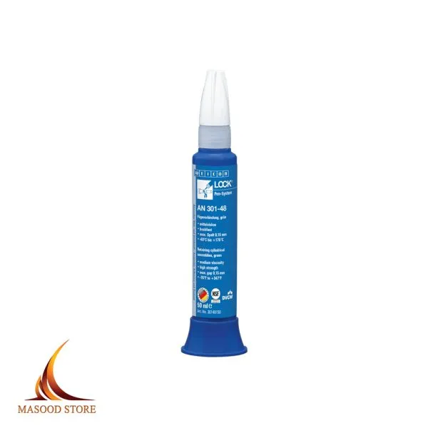 لاک آناروبیک ویکون AN301-48 یا چسب آب بندی غیر هوازی محصولی است به عنوان چسب نگهدارنده و تثبیت کننده ی قطعات کروی ، بلبرینگ ها ، بوش ها، پیچ و مهره و سایر اتصالات پرس شده . این چسب توسط مهندسین آلمانی شرکت ویکون بر پایه رزین متاکریلات طراحی شده است . غلظت این چسب در درجه ی متوسط و استحکام آن در درجه ی بالا است و توان بسیار خوب در تحمل حرارت دارد . استحکام آن از لغزش و شوک در برابر ضربات و تنش های فیزیکی به طور کامل و عالی جلوگیری می کند ولی برای جداسازی پس از خشک شدن به ايجاد حرارت در محل و استفاده از ابزار آلات نياز دارید . مدت زمان خشکی اولیه آن ۲ الی ۶ دقیقه است که در این زمان شما فرصت ریگلاژ خواهید داشت . خشکی و سفتی نهایی چسب نیز پس از 2 الی 4 ساعت ظاهر می شود . حداقل دمای کاربری آن از 60 – و حداکثر آن ۱۷۵ + درجه ی سانتی گراد می باشد و رنگ آن به رنگ سبز است . و دارای تاییدیه NFS و DVGW می باشد .